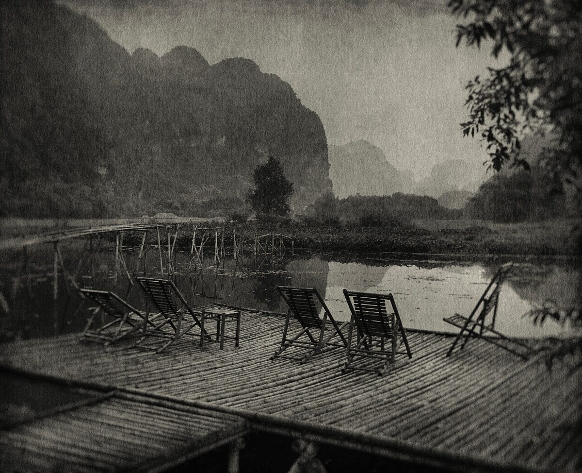 Dans un autre genre, FLORE se joue tout autant des réminiscences. Ses compositions aux allures d’estampes – bordées de toutes sortes de cadres ornementés rappelant la peinture – nous transportent dans un univers hors du temps en bien des aspects. Au cœur de L’Odeur de la nuit était celle du jasmin se trouvent des espaces dignes de la littérature de Marguerite Duras. Bateau voguant à l’horizon, chaises abandonnées sur un ponton désert, balcon donnant sur la nature sauvage… Tous laissent présager le passage des êtres. Dépeuplés, les voilà prêts à accueillir des bribes d’une existence romancée, celle qu’aurait pu y mener l’écrivaine qui aimait tant réécrire son quotidien. À cela s’ajoute enfin le mythe familial de la photographe elle-même. Ses grands-parents ont habité Saïgon à la même époque et n’ont cessé de lui raconter des histoires vagues, altérées par le tumulte du temps qui défile. Les deux types de récits se répondent ainsi avec poésie tout en laissant place aux fantaisies de nos projections.