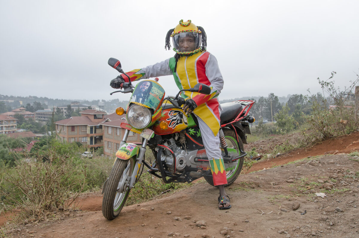 Boda Boda Madness démarre d’une envie commune avec le designer de mode kenyan ougandais Bobbin Case. À Nairobi, les conducteurs de Boda Boda (taxi moto) customisent leurs véhicules pour attirer les clients. Les deux compères ont alors l’idée de leur confectionner des tenues assorties à leurs motos. « Tous les chauffeurs de Boda Boda veulent avoir la moto la plus cool de Nairobi. On voulait les représenter comme de véritables superstars », précise Jan. Collaboration oblige, les deux artistes se sont adaptés aux volontés de chacun. « Le pilote rasta voulait avoir un casque dans lequel ses dreadlocks étaient encore visibles. Nous y avons donc fait deux trous ». Ses portraits constituent un résultat délicieux et inattendu où chaque détail compte. Réalité ou fantaisie ? La question se pose face à ces images de super-héros.