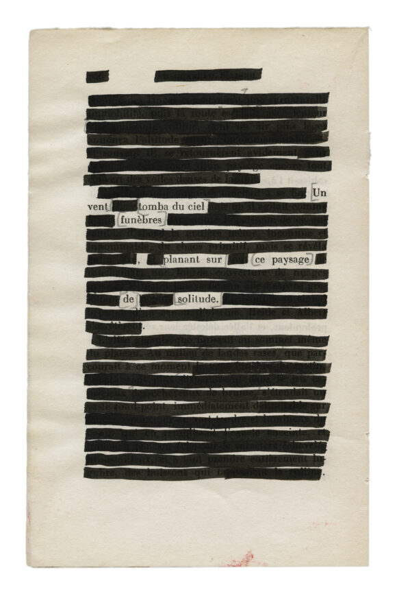 Le cut-up est une technique littéraire expérimentée par William S. Burroughs. Il découpait les textes originaux en fragments aléatoires puis les réarrangeait pour produire un nouveau texte. Dans mon cas, je parle de “demi cut-up” pour plusieurs raisons. Je ne découpe pas le texte original ni ne le réarrange. Je “cadre” certains mots et en mets d’autres “hors champ”, en les exposant ou en les masquant à l’encre et au pinceau. Je conserve également l’ordre d’écriture. Les contraintes me cadrent et participent à ma créativité. C’était important de travailler la matière première à travers les mots et le papier. Le texte n’est pas vraiment nouveau, il est fragmenté pour prendre un autre sens. Il y a au maximum un “demi cut-up” par page. Avec cette règle, je pouvais écrire par procuration.