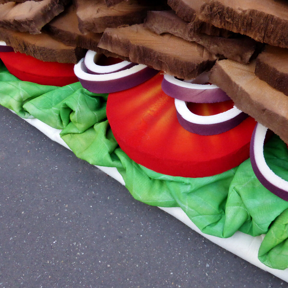 “Tracing and cutting tomatoes and onions in the foam. Slicing the tomatoes so their width is proportional to the bred, spray-painting the heart a lighter colour than the skin to give it the appearance of a ripe fruit”,