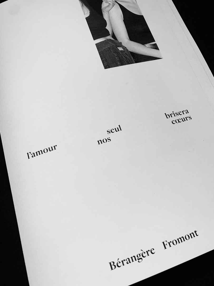 À l’origine du projet se trouve une envie de représenter une partie de la communauté LGBTQIA+ souvent mise à l’écart. « L’homosexualité féminine est invisibilisée dans l’art comme dans la société, contrairement à la culture gay. Fantasmée, déformée, colonisée, la représentation des lesbiennes dans ma jeunesse n’existait pas, en dehors de quelques films pornographiques hétérosexuels, où l’on pouvait voir des filles aux ongles et cheveux longs présentes uniquement pour le regard masculin. Il est temps de créer nos propres archives en produisant nos propres récits », déclare la photographe. De la même manière que Romy Alizée s’attache à révéler un regard queer, L’amour seul brisera nos cœurs parvient à souligner l’émotion de ces liaisons d’un même genre. À travers l’effervescence des cadrages, des scènes figées, les corps dialoguent, aux yeux de tous et toutes, et traduisent l’attachement. Une douce affection, une tendresse touchante. À la fois objet de témoignage et d’engagement, l’ouvrage de Bérangère Fromont s’impose comme une œuvre complète, complexe, mais avant tout, universelle. « Ça parle d’amour, de précarité, de joie punk et émo, de sexualité. Ça emmêle directement le corps au politique, ça prône haut et fort l’expérimentation et la satire, ça précise une volonté très forte de faire la révolution. », écrit Élodie Petit. Et la photographe, de conclure : « Mon approche de ce sujet est à la fois intime, amoureuse, poétique, politique, sensible, quotidienne ».